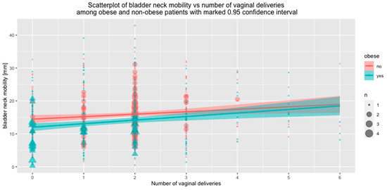 Associations between BN mobility and the number of VDs were also assessed relative to BMI. Both in the subgroup of women with BMI < 30 and in the subgroup of obese women, the number of vaginal deliveries correlated positively with BN mobility. However, in the obese group, VDs were associated with a significantly greater increase in BN mobility compared to non-obese women (BMI < 30) (Figure 4).