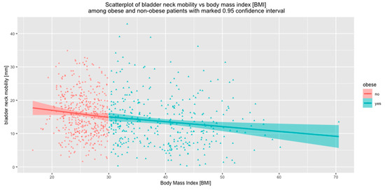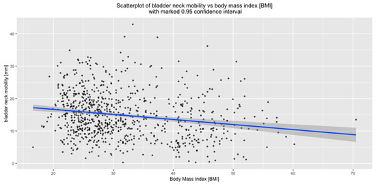 In the current study, urethral mobility decreased with increasing BMI, and this effect was observed in the whole study group, both women with normal weight and obese patients. This is certainly related to significantly longer urethras [1] and higher BN position at rest in obese patients shown in the current study. It is widely agreed that obesity influences various kinds of lower urinary tract symptoms, including SUI. Associations between BMI and urinary incontinence were evaluated in several studies [33,34]. The results of the present study implicate that the higher occurrence of SUI in obese patients is not related to BN mobility. Presumably, urethral sphincter deficiency and the higher intra-abdominal pressure are the primary factors responsible for stress incontinence in those women.