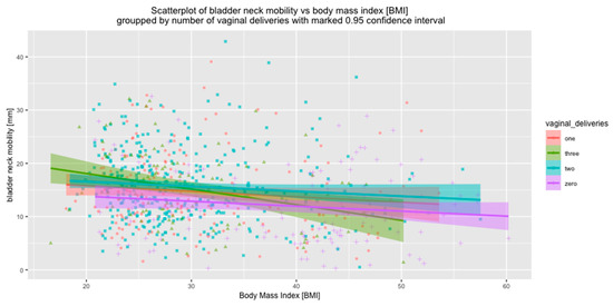 The correlations between BMI and BN mobility were also investigated in the subgroups of women who had had VDs, with regard to the number of VDs. It was shown that the influences of BMI and VDs on BN mobility are independent. With increased BMI, BN mobility decreased, independent of the number of VDs (p < 0.001 in all subgroups) (Figure 7).