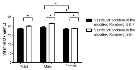 Interactions among vitamin D, sex, and osteoporosis for the relation with the vestibular problems in the modified Romberg test.