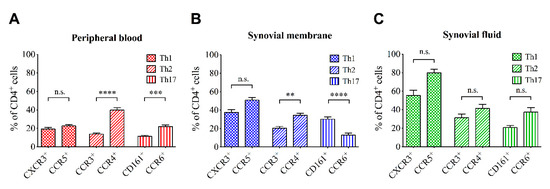 Percentage rates of different T helper cell subsets (Th1, Th2, Th17) within (A) peripheral blood, (B) synovial membrane and (C) synovial fluid samples according to their surface marker expression. p-Values < 0.05 were considered statistically significant and are indicated with asterisks: ** p < 0.01; *** p < 0.001; **** p < 0.0001. Data are presented as mean ± standard error of the mean (SEM). CD = cluster of differentiation; CXCR3 = C-X-C motif chemokine receptor 3; CCR = C-C chemokine receptor; n.s. = not significant.
