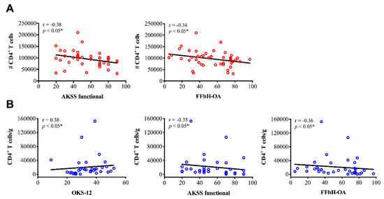 Correlation analyses between CD4+ T cells and clinical parameters of knee osteoarthritis (OA) patients. Spearman’s rank correlation coefficient (r) revealed significant moderate associations between CD4+ T cell infiltration in (A) peripheral blood (PB) and (B) synovial membrane (SM) samples of knee OA patients and joint function. (A) Higher numbers (#) of CD4+ T cells in PB correlate with poorer AKSS functional and FFbH-OA scores. (B) Increased CD4+ concentration levels in SM samples are associated with reduced knee function across all functional scores (OKS-12, AKSS functional, FFbH-OA). p-Values < 0.05 were considered statistically significant and are indicated with asterisks: * p < 0.05. AKSS = American Knee Society score; CD = cluster of differentiation; FFbH-OA = Hannover Functional Questionnaire of functional disability caused by OA; OKS-12 = Oxford Knee Score.
