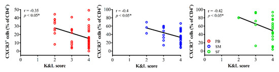 Interestingly, the mean percentage rate of CXCR3+ cells (% of CD4+) significantly correlated with K&L scores. Higher rates of CXCR3+ cells in all tissue types (PB, SM and SF) were observed in patients with less severe OA (Figure 3). In PB samples both increasing total CXCR3+ cell counts and concentration levels are associated with lower K&L scores, additionally.