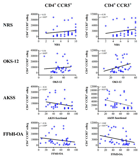 Interestingly, CCR3+ Th cells show a similar correlation pattern when compared to the results for CCR5+ (Th1) cells (Figure 4). There were no associations between CCR3+ Th cell infiltration in PB and clinical outcome. Yet, infiltration of the SM with CCR3+ Th cells correlated significantly with OA-related knee pain and disability. As illustrated in Figure 4, OA patients with higher concentration levels of CCR3+ Th cells in SM samples reported to suffer from more severe pain (NRS) and reduced joint function in all functional assessment scores (OKS-12, AKSS functional, FFbH-OA). Furthermore, increasing numbers (total cell count) of CCR3+ Th cells in SF significantly correlate with poorer outcome in the AKSS functional score. In contrast, for CCR4+ Th cells correlation analyses only revealed associations between SM infiltration and the AKSS functional score. Higher concentration levels and numbers (total cell count) of CCR4+ Th cells in SM correlated with reduced AKSS functional scores (r = −0.34, * p < 0.05). Correlations between CCR4+ Th cells and other assessment scores were not observed neither in SM nor in samples of PB and SF.