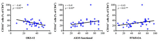 In brief, there were no associations between clinical outcome scores and infiltration of PB for both CD161+ and CCR6+ Th cells. In contrast, analyses of SM samples revealed that the mean percentage rate of CD161+ Th cells (% of CD4+) significantly correlated with joint function. Higher percentage rates of CD161+ Th cells were associated with better outcome in OKS-12, AKSS functional and FFbH-OA scores (Figure 5). CD161+ Th cell concentration levels in SM did not show associations with clinical data. For CCR6+ Th cells we observed that higher concentration levels in SM and SF were associated with worse AKSS functional and OKS-12 scores, respectively.