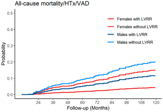 The LVRR is a complex process that usually starts with the introduction of medical therapy and takes up to 24 months to complete [1]. Although several factors have been associated with the occurrence of LVRR over time [5], so far, little is known about the influence of sex on the rate of LVRR. Similarly to previous reports [5], in our population approximately 30% of patients experienced LVRR at 24 months of follow-up and the occurrence of LVRR was strongly associated with better prognosis (HR 0.01, 95% CI 0.001–0.04, p < 0.001). Interestingly and unexpectedly, the rate of LVRR was comparable between man and women (Figure 1). Noteworthy, among patients experiencing LVRR, females had an overall better prognosis compared to males during a very long-term follow-up; conversely a comparable prognosis between males and females without LVRR was found. To evaluate the prognostic impact of sex over time, we used a multi-state model considering the occurrence of LVRR as an intermediate state. The LVRR was confirmed as a long-term prognostic predictor and the female sex was strongly associated with better outcomes predominantly in patients experiencing LVRR whereas its prognostic implications were diluted in those not experiencing LVRR (Figure 3).