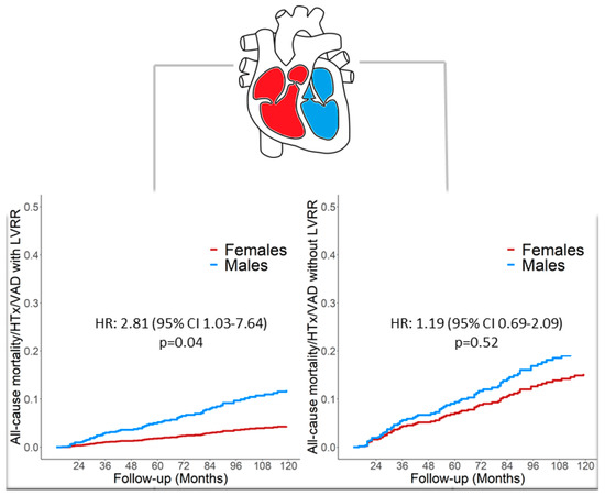 Central Illustration Schematic representation of the main results of the study. The rate of LVRR is comparable between sexes; however, male sex is an independent adverse prognostic factor regardless of the occurrence of LVRR. Legend: Legend. HTx: Heart Transplantation; LVRR: Left Ventricular Reverse Remodelling; VAD: Ventricular Assist Device.