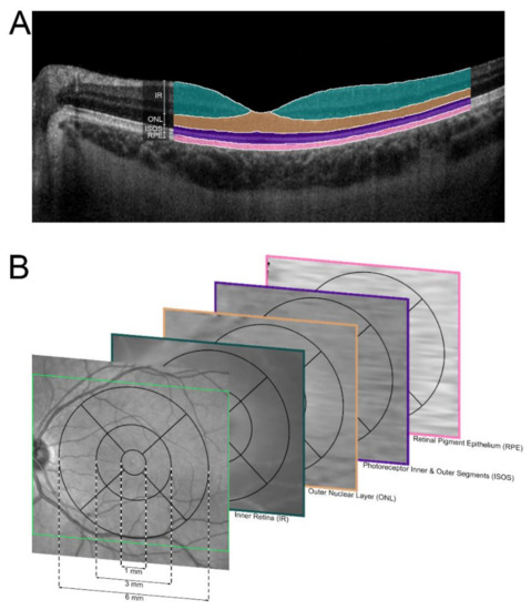 Image annotation and analysis. (A) Spectral-domain optical coherence tomography was semi-automatically annotated. The herein used segmentations for the inner retina (IR, green overlay), outer nuclear layer (ONL, yellow overlay), photoreceptor inner and outer segments (ISOS, purple overlay), retinal pigment epithelium (RPE, pink overlay) are highlighted color-coded. (B) An ETDRS grid was registered to the thickness maps of the respective OCT layers. For each subsegment, the mean thickness was extracted.