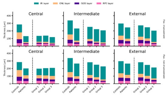 Retinal layer thickness measurements, eccentricity and foveal status. The bar plots demonstrate the mean retinal layer thickness measurements in the central subfield (first column), intermediate subfields (second column) and external subfields (third column) of the ETDRS, for controls’ and patients’ eyes depending on the presence (first row) or absence (second row) of foveal involvement. Patients’ eyes were further divided according to full-field electroretinogram based group classifications. Compared to controls, patients’ eyes revealed reduced retinal thickness in each eccentricity, especially in the outer nuclear layer (ONL, yellow) and the photoreceptor inner and outer segment layers (ISOS, purple). In the central subfield, the retinal thinning was expressed in eyes assigned to all groups of patients, while in the more eccentrically subfields, it was increasingly expressed from group 1 over group 2 to group 3 eyes. Concerning the foveal status, the most obvious difference was noticeable in the central subfield, where the retinal thinning was distinctly more pronounced in eyes with foveal involvement. The bar plots and exact numbers of measurements according to each ETDRS subfield can be found in Supplementary Figure S3 and in Supplementary Table S2, respectively. IR: inner retina (green), RPE: retinal pigment epithelium (pink).