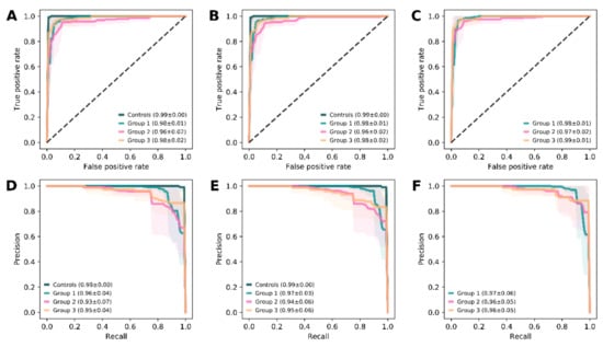 Using our classifier ensemble model, panretinal function in terms of full-field ERG results (groups 1 to 3, as proposed by Lois and colleagues) [9] could accurately be predicted based on each feature set without much difference: With feature set A (i.e., pure objective retinal layer thickness data), the accuracy of the prediction was 99.68 ± 0.64% to differentiate controls and patients, as well as 94.63 ± 2.57%, 93.52 ± 2.49%, and 96.99 ± 2.51% to categorize patients into groups 1, 2, and 3, respectively (Figure 3A,D). Using additional features did not lead to significantly more accuracy in this context: For feature set B (i.e., all structural data), the model correctly differentiated controls from patients with 99.53 ± 1.02% accuracy, and patients into groups 1, 2 and 3 with accuracies of 93.84 ± 2.18%, 93.36 ± 2.22% and 96.84 ± 2.36%, respectively (Figure 3B,E). For feature set C (i.e., structural and demographic data), the accuracy of the prediction revealed values of 94.79 ± 1.86% (group 1), 95.11 ± 1.92% (group 2) and 97.47 ± 2.03% (group 3, Figure 3C,F).