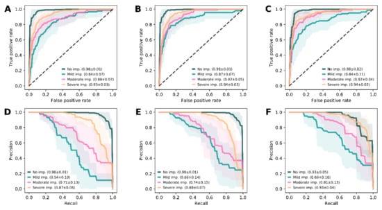 Model performance for the prediction of visual impairment. Receiver operating characteristic (ROC) curves that describe the true positive rate versus the false positive rate (top row, A–C), and graphs that plot the precision against the recall (bottom row, D–F), are demonstrated for the models predicting the grade of visual impairment (imp.) based on feature set A (first column, A and D), B (second column, B and E), and C (third column, C and F). The lines represent the mean (± standard deviation, shaded area) of all folds for category according to visual impairment, and the given values are the respective area under the curve (mean ± standard deviation). The robustness and power of the models to predict the grade of visual impairment was best for correct prediction of the extreme values (no impairment, dark green; severe impairment, yellow). The use of pure retinal thickness data (feature set A, first column) already reached the performance level of the models using additional features (feature set B, second column; feature set C, third column).