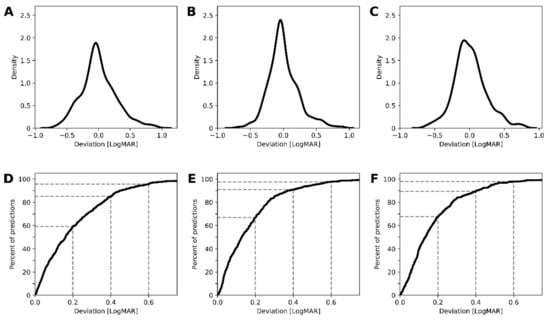Model performance for the prediction of best corrected visual acuity (BCVA). The density plots that demonstrate the deviation of the predictions from the measured BCVA values (top row, A–C), and graphs that plot the cumulative true positive rate against the deviation (bottom row, D–F), are demonstrated for the models based on feature set A (first column, A and D), B (second column, B and E), and C (third column, C and F). The inclusion of foveal status with (feature set C, third column) or without (feature set B, second column) demographic data improved the performance of the ensemble machine learning algorithms compared to pure retinal thickness data (feature set A, first column). LogMAR: Logarithm of the Minimum Angle of Resolution.