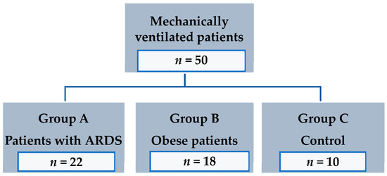 Between April 2017 and January 2019, we included 50 patients (mean age 68 ± 13; 31 males, 19 females) in the study. Twenty-two were mechanically ventilated because of ARDS and were enrolled in group A. Group B consisted of 18 obese patients but without ARDS. In group C (control) we enrolled 10 patients, who had neither ARDS nor were obese (Figure 1). Main baseline characteristics of patients at day 1 are presented in Table 1. Weight and BMI were highest in Group B, with no differences between group A and C. Patients were ventilated with a VT between 6 and 7 mL/kg pbw. P/F ratio was not significantly different in the three groups.