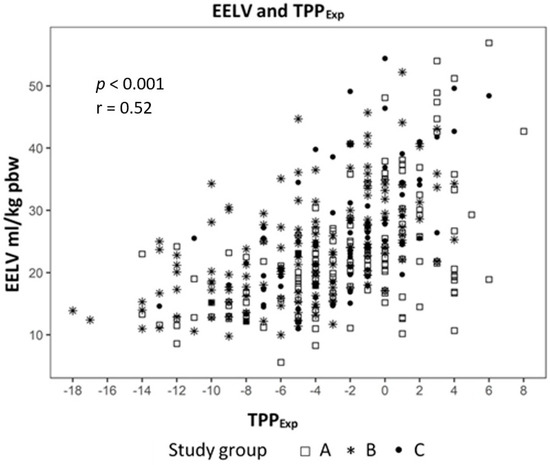 Correlation between end-expiratory lung volume (EELV) and transpulmonary expiratory pressure (TPPExp).
