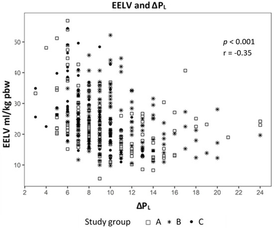 Correlation between end-expiratory lung volume (EELV) and transpulmonary pressure (ΔPL).