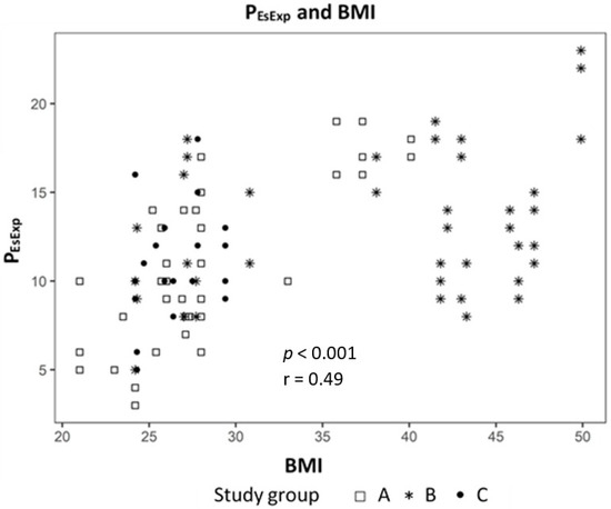 Correlation between body mass index (BMI) and transpulmonary expiratory pressure (PEsExp).