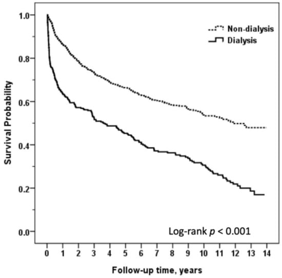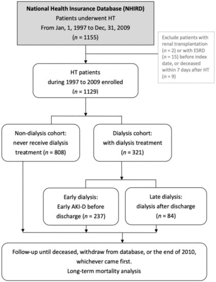 The primary outcome was renal failure requiring dialysis. Patients were grouped into the dialysis cohort if they had required renal replacement therapy (RRT) after HT. Otherwise, they were categorized into the “non-dialysis” cohort. The secondary outcome was mortality throughout the follow-up period. The endpoint of follow-up was the ending date of NHI coverage or the end of the study on 31 December 2010. The ending date of NHI coverage was demonstrated to be a suitable proxy for patient survival [21].