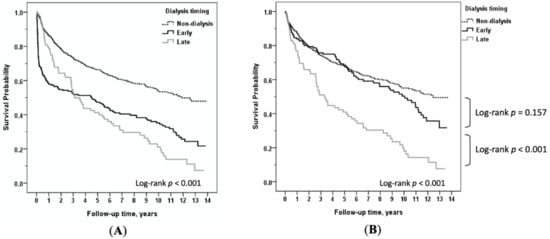 (A) Comparison of long-term survival among heart transplant recipients with non-dialysis versus early dialysis versus late dialysis; (B) among non-dialysis versus early dialysis versus late dialysis, conditional on survival to 3 months after heart transplantation.