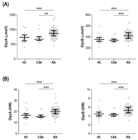 Comparative analyses of glycoprotein signals across study groups. Glycoprotein levels (GlycA and GlycB) measured as absolute levels (A) or height to width (H/W) ratios (B) were compared across healthy control (HC), clinically-suspect arthralgia (CSA) individuals, and early rheumatoid arthritis (RA) patients. Each dot depicts an individual, bars represent medians, and whiskers correspond to 25th and 75th percentiles. Differences were assessed by Kruskal–Wallis tests with Dunn–Bonferroni posthoc tests. The p-values from the latter were indicated as follows: ** p < 0.010 and *** p < 0.001.