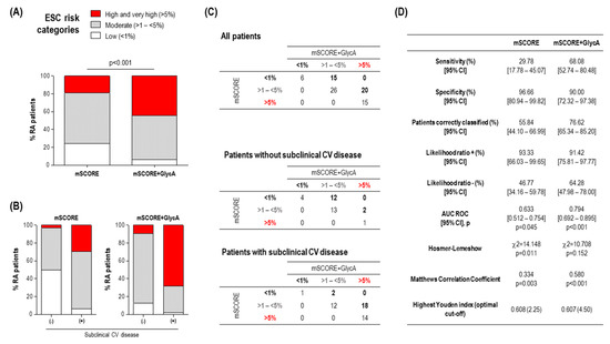Next, whether GlycA levels could be of clinical relevance to identify patients with subclinical CV disease, alone or in combination with traditional CV risk factors, was assessed. GlycA alone was able to discriminate the presence of subclinical CV disease (AUC ROC (95% CI), p: 0.658(0.538–0.777), p = 0.018). Adding GlycA quartiles to the mSCORE improved the identification of subclinical CV disease (Figure 2). Only 18.9% of RA patients were classified as having high/very high risk based on the mSCORE (Figure 2A), whereas adding GlycA increased this figure to 44.3%. This change was more evident in patients with subclinical CV disease (29.7% vs. 68.9%), whereas it has a negligible effect in those without (3.12% vs. 9.37%) (Figure 2B). Adding GlycA to the mSCORE allowed to reclassify 35 patients to higher risk categories, whereas it did not result in reclassification to lower risk strata (Figure 2C). Interestingly, most of the patients reaching the high risk category exhibited plaque occurrence (18/20), whereas those reaching the moderate cut-off were mostly free of subclinical CV disease (2/15) (Figure 2C). As a consequence, adding GlycA to the mSCORE resulted in a better discrimination capacity (AUC ROC) (Figure 2D) and was found to provide additional value to the discrimination (difference between areas (De Long statistic): 0.172 (0.096–0.247), p < 0.0001). Moreover, adding GlycA to the mSCORE improved classification metrics (sensitivity, rate of patients correctly classified, and Matthews correlation coefficient) and also improved the risk prediction (Hosmer–Lemeshow statistic) (Figure 2D). More importantly, despite reaching similar highest Youden indices, the optimal cut-off value achieved by adding GlycA to mSCORE was more realistic for stratification than that of mSCORE alone (Figure 2D), which was mostly specificity-skewed. In order to further quantify the improvement resulting from adding GlycA to the mSCORE, the NRI and IDI were computed from the predicted risks retrieved in logistic regression models. Adding GlycA to the mSCORE yielded a NRI of 0.587 (0.419–0.753) (p = 0.011) with an IDI equal to 0.225 (0.137–0.312) (p < 0.001), hence confirming the GlycA-driven improvement in the classification.