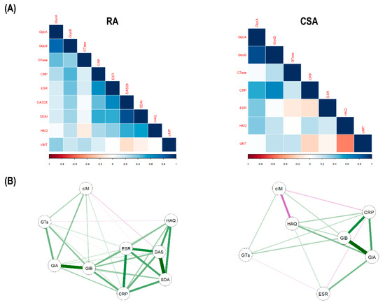 Integrative analyses of glycoprotein profiles, glycosyltransferase activity, and inflammatory markers. (A) The correlations among glycoprotein levels (GlycA and GlycB), glycosyltransfersase activity (GTase), inflammatory parameters (CRP and ESR), disease indices (DAS28, Simplified Disease Activity Index (SDAI), and Health Assessment Questionnaire (HAQ)) and carotid intima-media thickness (cIMT) were plotted in correlation matrices. In these correlograms, the colour of the tiles is proportional to the strength of the correlation between each pair of variables, according to the legend at the bottom. Names of the variables are indicated in red. (B) Network analyses depicted based on the correlations among variables. Each node corresponds to a variable (GlA: GlycA, GlB: GlycB, GTs: GTase, cIM: cIMT, DAS: DAS28, SDA: SDAI) and the lines between nodes illustrate the strength (width) and type (green: positive, red: negative) of the correlations between each pair of nodes. The relative position of the nodes parallels its degree of correlation, that is, nodes more closely correlated locate closer to each other.