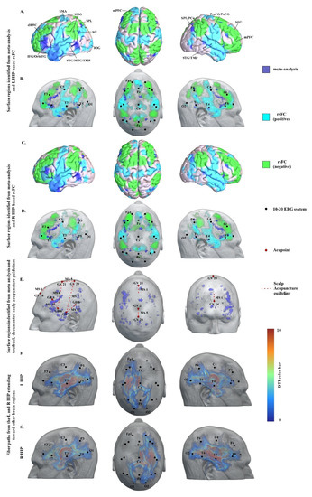 Potential targets for scalp stimulation for dementia identified from imaging study and acupuncture guidance. (A,B) Surface regions identified from meta-analysis and L HIP-based rsFC. (C,D) Surface regions identified from meta-analysis and R HIP-based rsFC. (E) Surface regions identified from meta-analysis and textbook-documented scalp acupuncture guidelines. (F,G) Fiber paths from the L and R HIP extending toward other brain regions. Abbreviations: L, left; R, right; HIP, hippocampus; rsFC, resting state functional connectivity; MTG, middle temporal gyrus; STG, superior temporal gyrus; IFG, inferior frontal gyrus; OrbIFG, orbital inferior frontal gyrus; dlPFC, dorsolateral prefrontal cortex; SMA, supplementary motor area; SPL, superior parietal lobule; PCu, precuneus; IOG, inferior occipital gyrus. TMP, temporal pole; SFG, superior frontal gyrus; mPFC, medial prefrontal cortex; PreCG, precentral gyrus; PoCG, postcentral gyrus; AG, angular gyrus; and SMG, supramarginal gyrus; MS, microsystem and scalppoints; MS 1, Ezhongxian; MS 5, Dingzhongxian; MS 6, Dingnieqianxiexian; MS 7; Dingniehouxiexian; MS 10, Nieqianxian; MS 11, Niehouxian; GV 20, Baihui; GV 21, Qianding; GV 24, Shenting; GB 4, Hanyan; GB 6, Xuanli; GB 7, Qubin; GB 8, Shuaigu.
