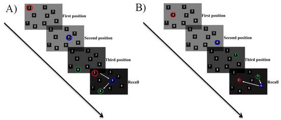Spatial Span Test. Example of a trial representing a sequence length of three cubes. (A) Trial of the Spatial Span Test in the forward application; (B) Trial of the Spatial Span Test in the backward application. White arrows mark the correct order in which subjects should have remembered the tapping sequence.