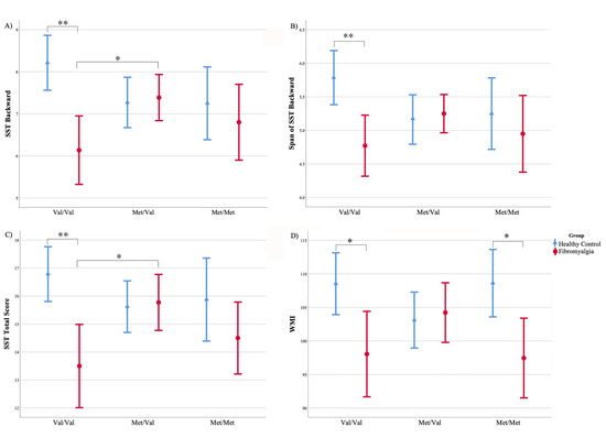 Means and standard errors related to the performance in the working memory tests. Data of fibromyalgia patients (red) and healthy controls (blue) are represented for each COMT genotype: Val/Val, Met/Val and Met/Met. (A) SST backward score, (B) span SST backward, (C) SST total score and (D) WMI. * p < 0.05; ** p < 0.001. SST, Spatial Span Test; WMI, Working Memory Index; Val, valine; Met, methionine.