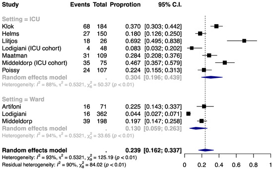 The proportion of COVID-19 patients who underwent thromboprophylaxis and developed VTE was estimated at 23.9% (95% CI, 16.2% to 33.7%; Figure 1). The incidence was higher in the ICU setting (30.4% (19.6% to 43.9%)) than in the ward setting (13.0% (5.9% to 26.3%)). Substantial heterogeneity was present within and across the subgroups (I2 = 88%, 94%, and 93% for ICU, ward, and overall) and could not be explained by the clinical setting (residual I2 = 90%). No significant small-study effect was noted by the funnel plot (Figure S2) or Egger’s test (P = 0.89; Table S4).