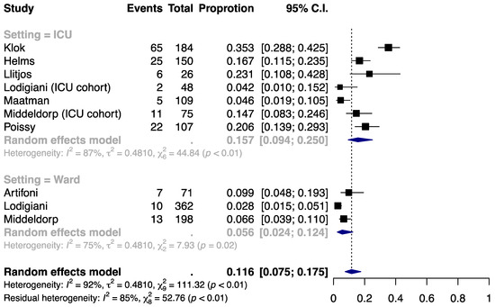 Approximately 11.6% (95% CI, 7.5% to 17.5%) of the anticoagulated COVID-19 patients developed PE (Figure 2). Similar to VTE, the incidence was higher in the ICU setting (15.7% (9.4% to 25.0%)) than in the ward setting (5.6% (2.4% to 12.4%)). A high degree of heterogeneity was present within and across the subgroups (I2 = 87%, 75%, and 92% for ICU, ward, and overall) and could not be explained by the clinical setting (residual I2 = 85%). No significant small-study effect was noted by the funnel plot (Figure S3) or Egger’s test (P = 0.06; Table S4).