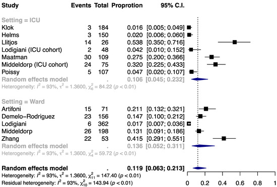The incidence of DVT was estimated at 11.9% (95% CI, 6.3% to 21.3%) among COVID-19 patients with thromboprophylaxis (Figure 3). The proportion was similar between the ICU subgroup (10.6% (4.5% to 23.2%)) and the ward subgroup (13.6% (5.2% to 31.1%)). Similarly, substantial heterogeneity was present within and across the subgroups (I2 = 93%, 93%, and 93% for ICU, ward, and overall) and could not be explained by the clinical setting (residual I2 = 93%). Funnel plot asymmetry was noted (Figure S4) and the Egger’s test suggested small-study effects (P = 0.0012; Table S4).