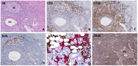 Histopathological features in parotid salivary glands of primary Sjögren’s syndrome patients (A) Lymphocytic infiltrate located around a hyperplastic striated duct (lymphoepithelial lesion: LEL) without obstructed lumen. Both (B) CD3+ T-lymphocytes and (C) CD20+ B-lymphocytes are present in the periductal infiltrate and within the ductal epithelium. (D) Presence of a germinal center, which was revealed by the presence of a cluster of ≥5 adjacent Bcl6-positive cells within a focus [28]. (E) Immunoglobulin A (IgA) (red) and immunoglobulin G (IgG) (brown) staining shows a plasma cell shift towards IgG plasma cells. (F) Salivary gland mucosa associated lymphoid tissue (MALT) lymphoma biopsy, which shows a diffuse CD20+ B-lymphocytic infiltrate around lymphoepithelial lesions in the absence of normal salivary gland parenchyma.