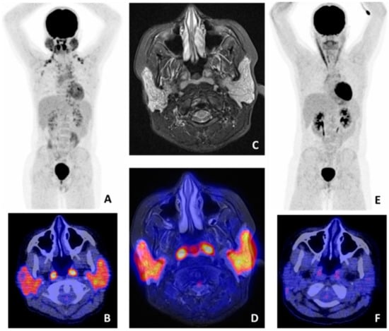 18F-fluorodeoxyglucose (FDG) positron emmison tomography/computed tomography (PET/CT) and magnetic resonance imaging (MRI) findings in a pSS patient with salivary gland mucosa associated lymphoid tissue (MALT) lymphoma. (A) Whole-body FDG-PET showing high heterogeneous FDG uptake in both parotid and submandibular glands. No other pathological lesions were found (axillary and clavicular regions with increased uptake represent brown fat). (B) FDG-PET/CT image showing pathological uptake in the parotid glands and physiological uptake in the tonsils. (C) MRI stir sequence showing a pathological, heterogeneous aspect of both parotid glands. (D) Manually fused FDG-PET/MRI image, showing pathological uptake in the parotid glands and physiological uptake in the tonsils. (E) Whole-body FDG-PET and (F) FDG-PET/CT image after treatment, showing no pathological uptake in the parotid glands, indicating complete remission.