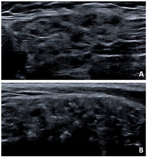 Salivary gland ultrasonography findings in pSS. Presence of hypoechogenic areas and hyperechogenic reflections in the (A) submandibular gland and (B) parotid gland of a pSS patient.