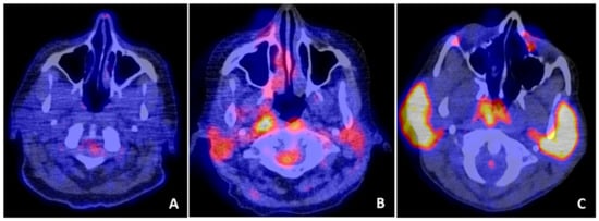 The most commonly used PET tracer is 18F-fluorodeoxyglucose (FDG). Uptake of this tracer is relatively higher in cells that are metabolically active, such as inflammatory cells. FDG is indicated in several infectious and inflammatory diseases and is useful for the diagnosis and follow-up of various autoimmune diseases [4,101,102]. In pSS patients, several case reports showed abnormal FDG uptake in salivary glands [103,104,105] (Figure 5). However, physiological FDG accumulation in salivary glands is highly variable, and subjects without known head and neck pathology frequently show increased FDG uptake in the salivary glands [106,107]. A possible explanation for the wide range in physiological uptake is that salivary glands of different subjects utilize different amounts of glucose for metabolism [108,109]. Which human salivary gland cells have the highest glucose uptake is not known, but in rodent salivary glands, both acinar and ductal cells seem to play a role in glucose uptake [110,111].
