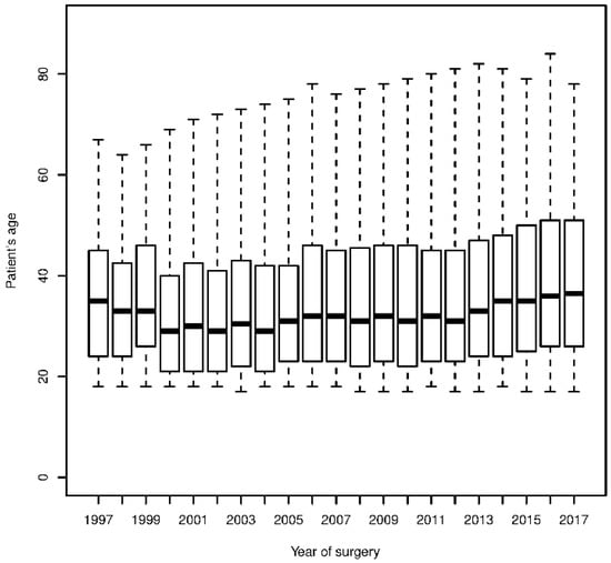Boxplot showing variation of patients’ age at surgery during the last two decades. Results are shown as median age, interquartile range and overall interval.