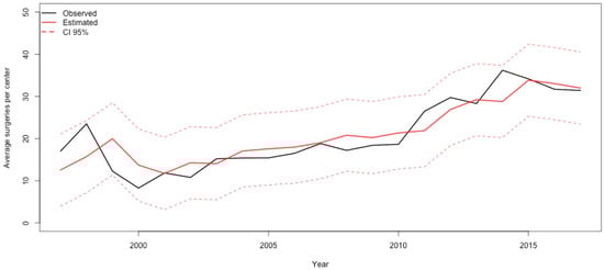 Time–series showing the observed (solid black line) and estimated (solid red line) average surgical workload according to the year of surgery in adult patients with congenital heart disease. Data shown as the average number of procedures per center. The 95% confidence interval is reported as dashed red line.
