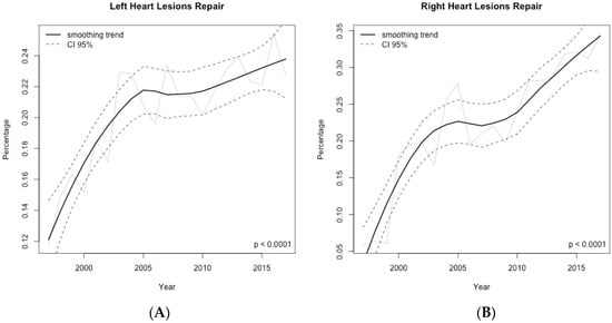 Time–series of the relative frequencies computed year-by-year for the main procedural surgical groups in adult patients with congenital heart disease. (A) left heart lesions repair; (B) right heart lesions repair. Data shown as rough number of the observed relative frequencies (solid black line) and smoothed trend (solid gray line) with 95% confidence interval (dashed black line).
