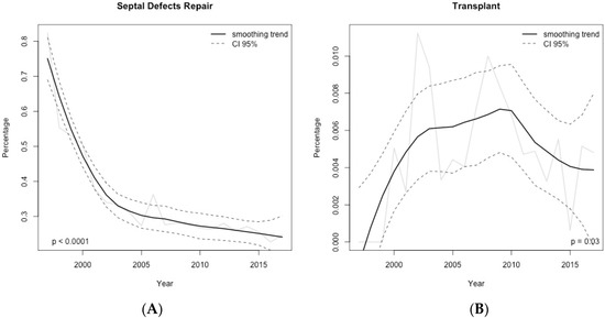 Time–series of the relative frequencies computed year-by-year for the main procedural surgical groups in adult patients with congenital heart disease. (A) septal defects repair; (B) transplants. Data shown as rough number of the relative frequencies (solid black line) and smoothed trend (solid gray line) with 95% confidence interval (dashed black line).