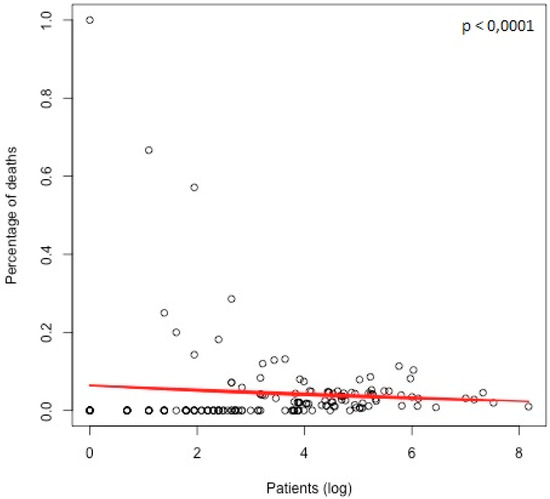 Graphic demonstration of the relationship between center volume (as patients, plotted in logistic scale) and the percentage of death. A significant inverse relationship was found between the two variables. The red line represents the logistic regression model estimated.