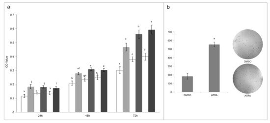 Despite the rising optical density identified by MTT assay between treatment lapses denoted cellular proliferation, to confirm that ATRA induce proliferation, a colonies formation assay was performed. As reported in the Figure 1, panel b, 10 µM ATRA significantly induced cellular proliferation generating an almost triple number of colonies in comparison to DMSO (553 ± 28 for ATRA in comparison to 183 ± 33 for DMSO; Figure 1b).