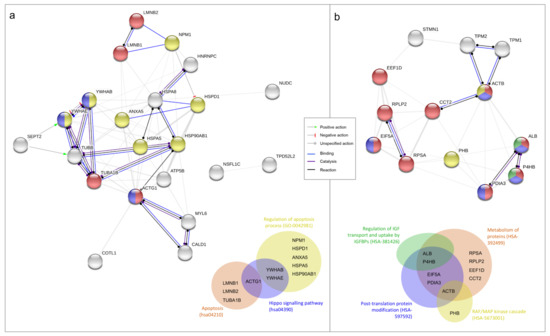 Functional proteins association networks identified by differential proteomic analysis and relative Venn diagrams. Interaction networks identified between under-expressed (panel a) and overexpressed (panel b) proteins in T24 cells after 3 days (72 h) of 10 µM ATRA treatment in comparison to vehicle treatment (DMSO). All the proteins identified by the proteomic analysis are reported; only the actions (lines between nodes) of the selected pathways are highlighted with the colors reported in the figure’s legend. Different colors of nodes indicate the following different functional relationships, according to STRING database and referring to Gene Ontology (GO), KEGG Pathway (hsa), and Reactome Pathways (HSA); identifier number is reported in the brackets. Nodes of multiple colors indicate belonging to multiple pathways. Venn diagrams summarize the affiliation of proteins to different molecular pathways. (a) Yellow nodes: regulation of apoptosis process (GO:0042981); red nodes: apoptosis (hsa04210); blue nodes: hippo signaling pathway (hsa04390). (b) Red nodes: metabolism of proteins (HSA-392499); blue nodes: post-translation protein modification (HSA-597592); green nodes: regulation of insulin-like growth factor (IGF) transport and uptake by insulin-like growth factor binding proteins (IGFBPs) (HSA-381426); yellow nodes: RAF/MAP kinase cascade (HSA-5673001).