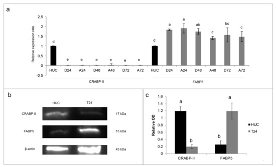 The expression of cellular retinol-binding protein-II (CRABP-II) and fatty acid binding protein 5 (FABP5) in T24 cell line. (a) mRNA expression after treatment with 10 µM ATRA for 3 days (72 h). As calibrator mRNA expression of HUC non-cancer cells (human urothelial cells) was used. The expression levels of CRABP-II and FABP5 were normalized to β-actin levels. The data are expressed as means ± SD (n = 9). Different letters indicate statistically significant differences. D24, D48, D72: control samples at 24 h, 48 h, and 7 h. A24, A48, and A72: treated samples with 10 µM ATRA for 24 h, 48 h, and 72 h. (b) CRABP-II and FABP5 proteins’ expression in untreated T24 and HUC cells. β-actin was the control. Representative image out of three. (c) Densitometry analysis of CRABP-II and FABP5 protein expression, normalized to β-actin optical density (OD). The data are expressed as means ± SD (n = 3). Different letters indicate statistically significant differences.