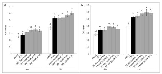 PPARβ/δ inhibition. MTT assays express as optical density (OD) values in T24 cells treated with DMSO, ATRA 10 µM, or ATRA 10 µM added with four GSK0660 (GSK, panel (a)) or PTS-58 (panel (b)) concentrations (5 µM, 10 µM, 15 µM, and 20 µM), selective and full PPARβ/δ antagonists, respectively, for 3 days (showed 48 h and 72 h results). Means ± SD (n = 12). Means with different letters are significantly different (p < 0.05) within each treatment lapse.