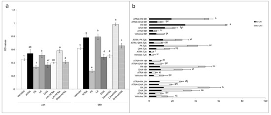 Finally, the apoptosis after PA and DHA with ATRA co-treatment was analyzed to understand the LCFA mechanism of ATRA-related proliferation reversion. As showed in Figure 5b, the PA as single treatment or in combination with ATRA, induced the higher percentages of apoptosis with peaks at 96 h of 67% and 51%, respectively. Instead, the action of DHA is different, which while alone produced modest percentages of apoptosis (between 17.5% and 36.5% in 96 h), in combination with ATRA it gave non-statistically different apoptosis rates from those of controls with vehicle during all the 96 h of treatment (Figure 5b).