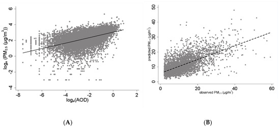 Association between measured PM2.5 with AOD and predicted PM2.5 values during the study period. (A) Association between airborne PM2.5 and AOD in South Florida, 2012–2016. (B) Predicted versus observed PM2.5 in South Florida, 2012–2016. AOD and PM were collocated if their time stamps were within ±0.75 h and located within 0.025° (or ~2.4 km) geographic distance.