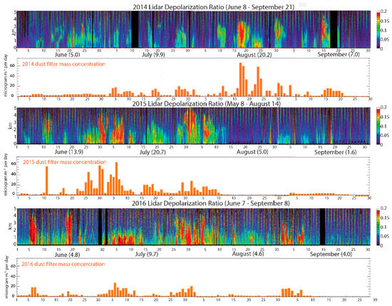 Dust events recorded between 2014 and 2016. LIDAR data coupled with in situ monitored PM10 using both gravimetric and photometric methods were used to identify dust days, and depolarized ratio was used as a proxy of dust intensity. The colored graphs show the LIDAR readings, with higher depolarization ratios are shown in red. The bar graphs show the corresponding increases in dust mass recorded by weighing air filters [33].
