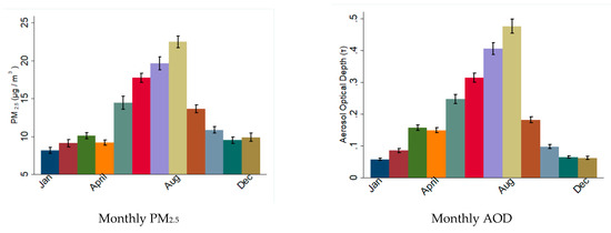 Monthly distribution of particulate material during the study period in South Florida. The graphs show the average values of PM2.5 and AOD recorded per month during the period 2012–2016. Note the higher values during summer months.