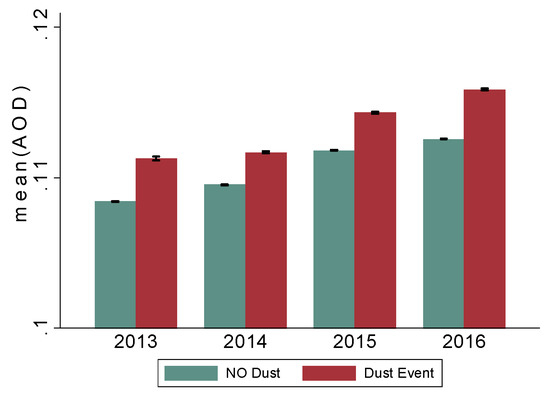 Mean AOD readings in the catchment area 2013–2014 during non-dust and dust events. Note: average AOD readings during dust and non-dust events have been increasing since 2013. AOD: Aerosol Optical Depth (AOD), a proxy of aerosol exposure, was computed at 3 km spatial resolution using satellite-derived MODerate Resolution Imaging Spectroradiometer (MODIS) data.
