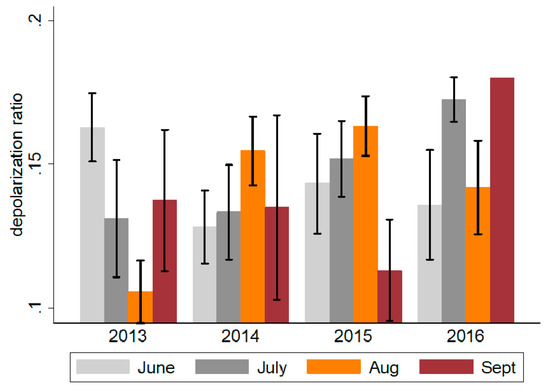 Monthly average depolarization ratio in the Miami catchment area during the summer months, 2013–2016. Obtained using LIDAR, depolarization ratios represent a measure of dust intensity. Values ≤0.1 represent mild dust events, 0.10–0.15 moderate events and ≥0.15 severe events.